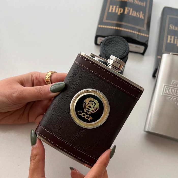 طری هیپ استیل با روکش چرمی ۳۳۰ میلی لیتری، کیفیت استثنایی، ضد زنگ، و طراحی لوکس.